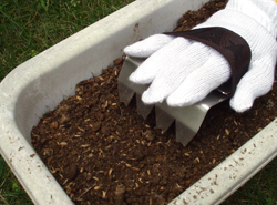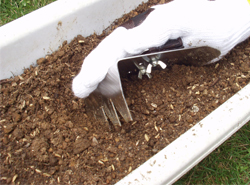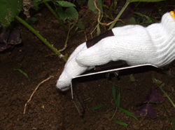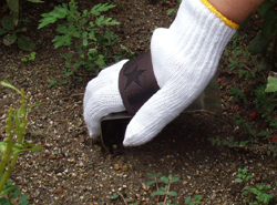 | 下記のような場合は、アイアンクローの角を使って掘り起こして頂くと、大変楽に作業できます。 |